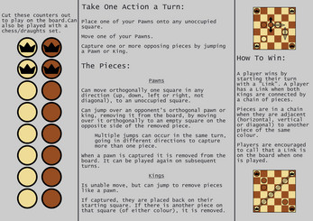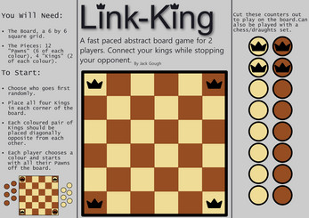 Link-King is a short abstract game for two players. It has been designed to fit onto one sheet of double-sided A4, and is meant to replicate the benefits of chess (and similar games) with a lower barrier to entry.